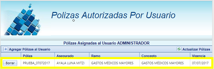 Nota: Si desea asignar más pólizas al usuario realice las indicaciones mencionadas en este apartado.