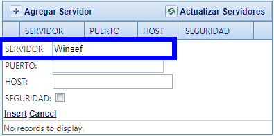 Para hacerlo desde el menú seguridad, de clic en el botón Configurar Correo; el sistema habilitará una ventana emergente, en ella de clic en la opción <agregar servidor>; registre en cada campo la siguiente información y de clic en la opción <Insert>