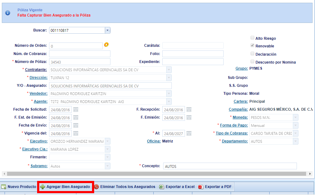 Para concluir con la captura de la póliza de Camiones, Autos, Motocicletas, Taxis, etc; realice los siguientes pasos: